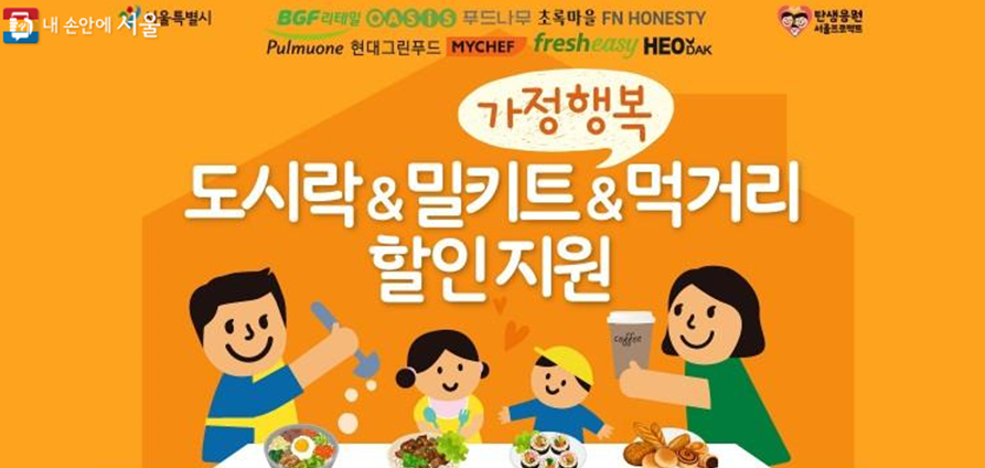 가정행복 도시락 밀키트 먹거리 할인지원 사업은 서울시 예산 지원 없이 협력사가 사회 공헌 차원에서 쿠폰비용을 전액 부담하고 있는 사업으로, 매월 할인 쿠폰을 지급하는 서비스입니다.