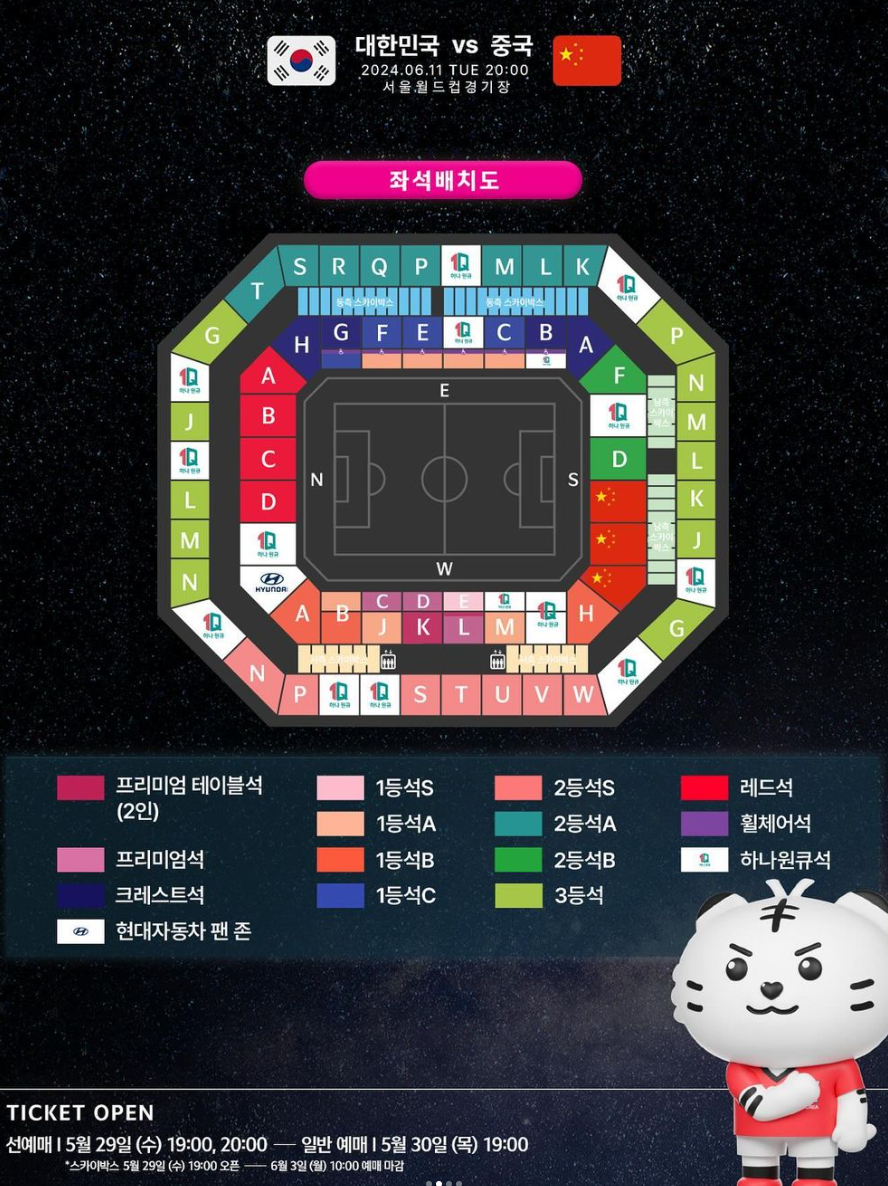 티켓 권종별 가격과 상암 월드컵 경기장의 좌석배치도입니다. 경기장 입장은 경기시작 2시간 30분전부터 가능합니다.